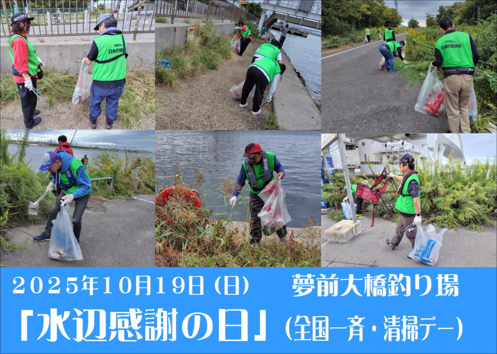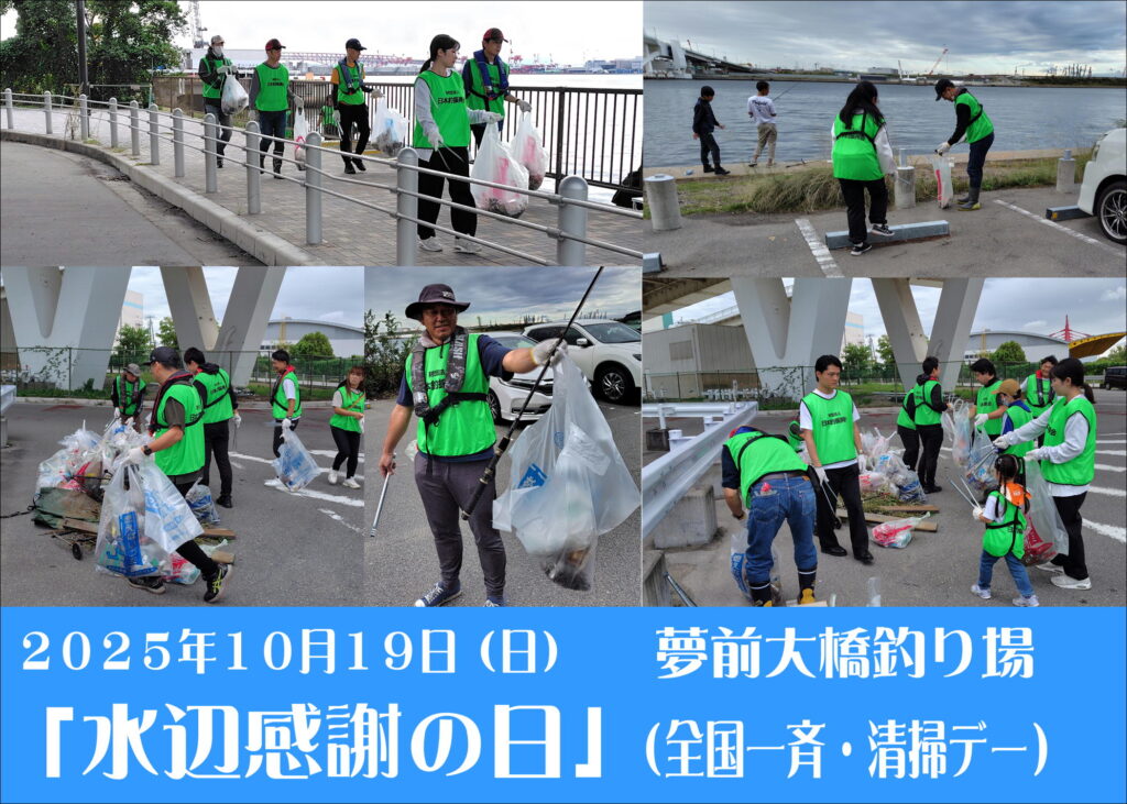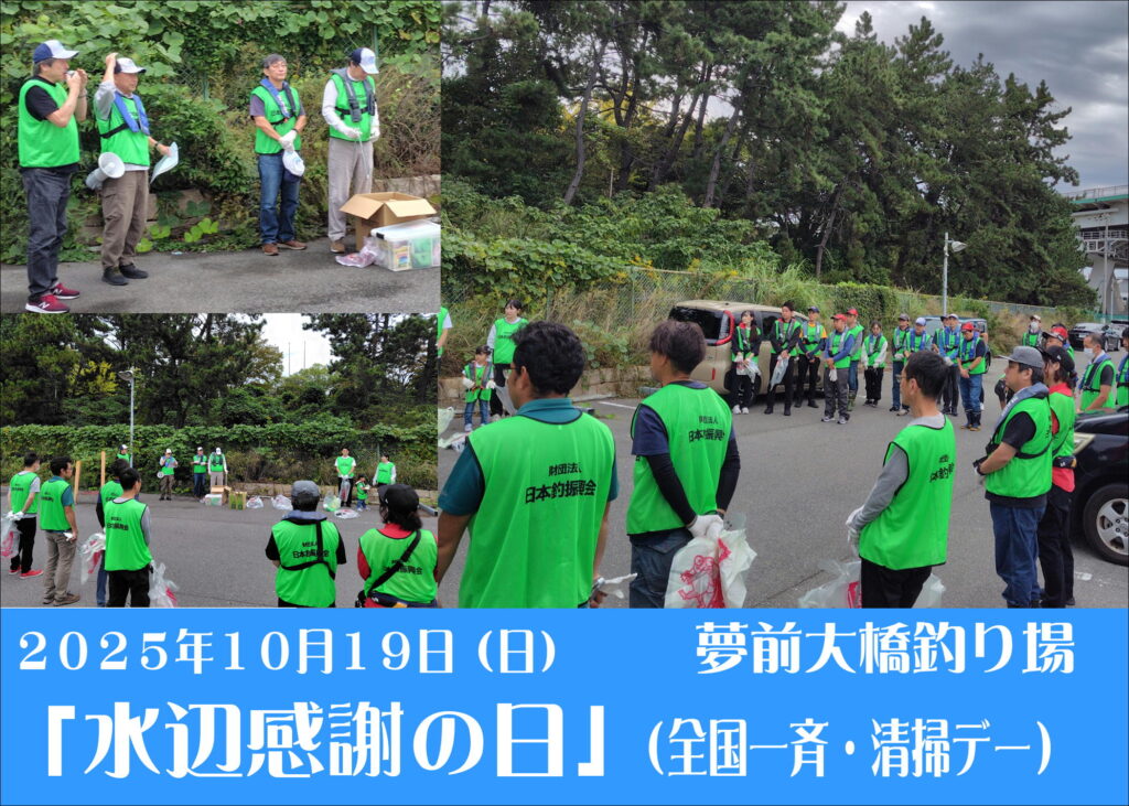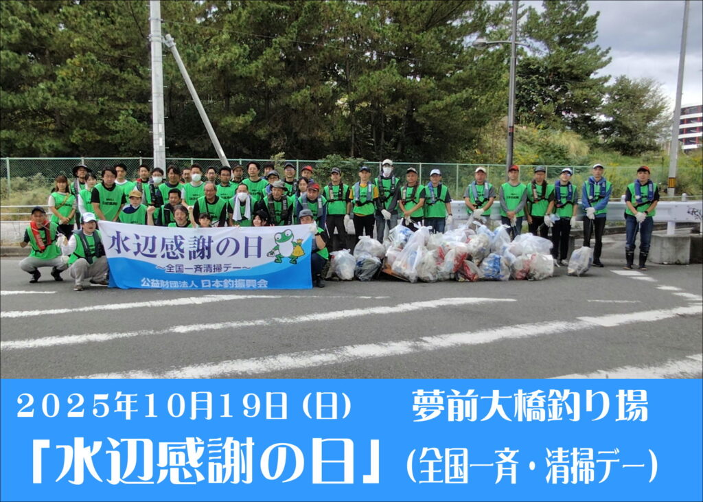 2025 水辺感謝の日(全国一斉・清掃デー) 2025.10.20 10月19日(日) 水辺感謝の日 北港舞洲 夢舞大橋で清掃活動が行われました。 当日は弊社からも多くのスタッフが参加しました。 年々ゴミの数が少なくなっています。 一人一人が自分のゴミを持ち帰れば釣り場は綺麗な状態です。 大切な釣り場を守る為に、自分の出したゴミは最低限各自で持ち帰りましょう。 主催:(公財)日本釣振興会・大阪府支部 後援:大阪釣具協同組合 ●問い合わせ:(公財)日本釣振興会・大阪府支部 TEL:06-6531-0987 一覧に戻る